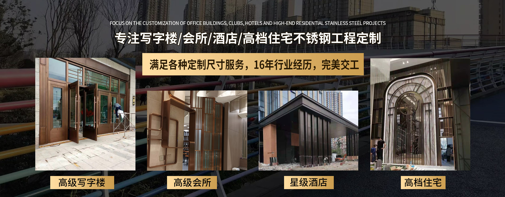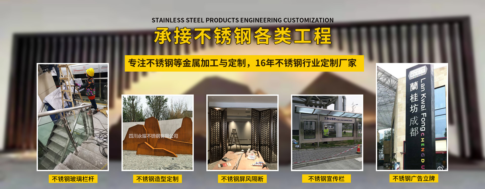 四川永耀不銹鋼有限公司是一家集開發(fā)、設計、加工、制作、安裝、并承接各種不銹鋼工程為一體的綜合性企業(yè)。多年來一直在專注于不銹鋼等金屬的加工與研發(fā)。在客戶群體中贏得了良好的聲譽,以專業(yè)專注的精神,致辭力于打造良好的產品和企業(yè)形象,對每一產品傾注全力,力爭每個細節(jié)精細,確保產品具有優(yōu)越的性能,優(yōu)美的外觀及優(yōu)良的品質,使公司產品深受廣大用戶的親睞。 本公司主要業(yè)務: 一、工程類 承攬:酒店、銀行、商鋪、寫字樓、公寓、城鐵、地鐵、公交、機關、 學校、廣場藝術雕塑、自動門、旋轉門、廣告欄、公